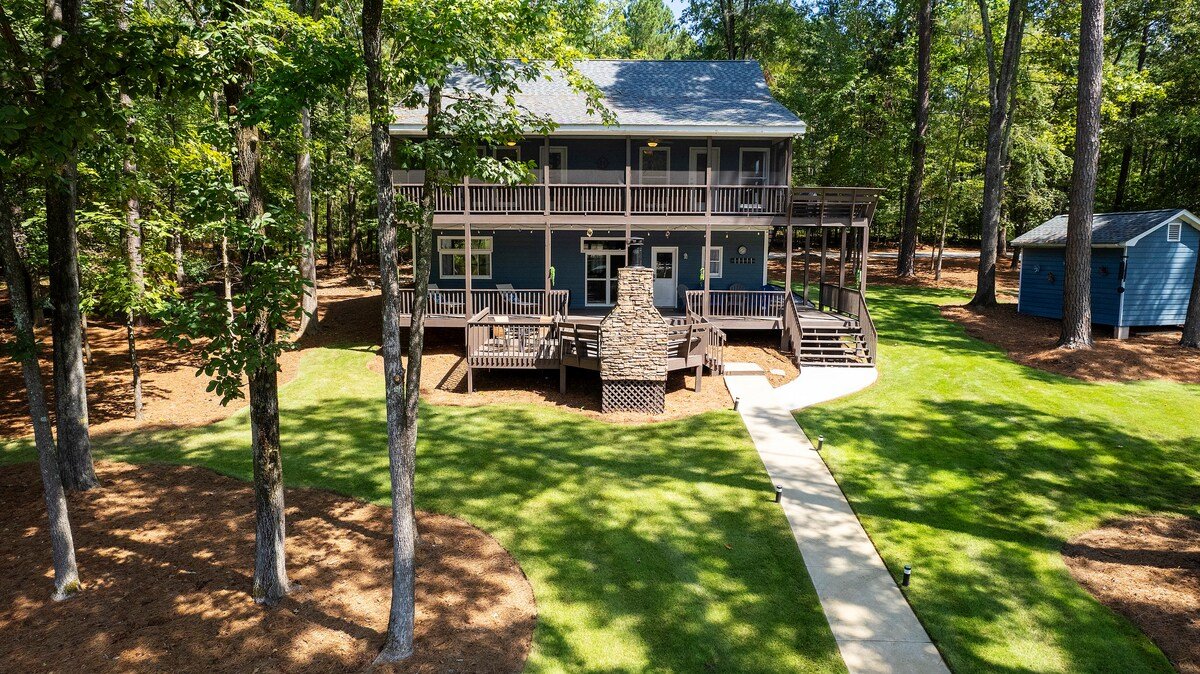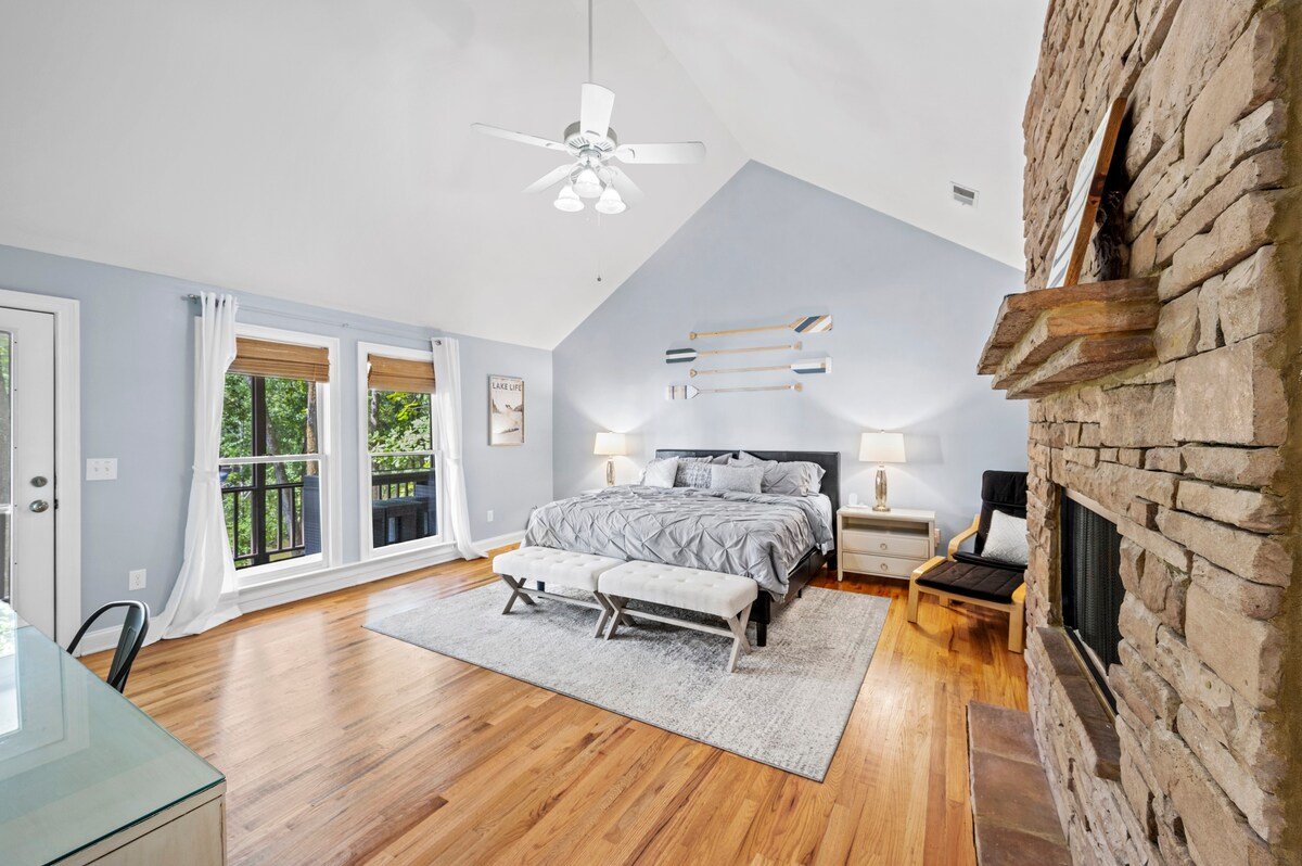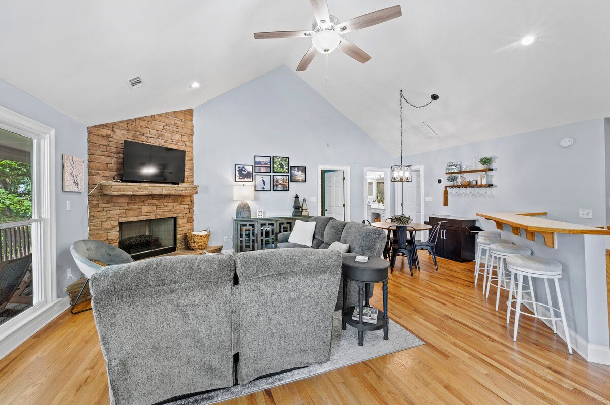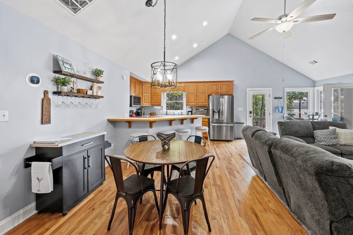 Lakeside Hideaway is a picturesque property in a tranquil, secluded cove off Sugar Creek. The 4br/2b home provides ample space for your vacation or a weekend getaway. Driving in you'll get the "Hideaway" vibe. The beautifully landscaped outdoor living area features a large deck w/fireplace & a firepit.Lower level has a living room, 2 bedrooms & full bath. Ascend to the upper level into the open living area, primary ensuite & 2nd bedroom.Lakeside Hideaway promises an unforgettable experience.